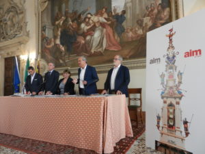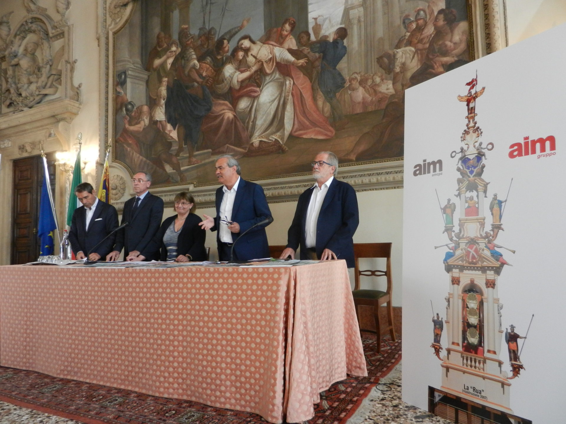 “Amcps nel 2007, per il centenario dalla nascita, ha voluto ricostruire la Rua per poi riallestirla per 6 volte in occasione del Giro della Rua – ha dichiarato il direttore generale di Aim Dario Vianello -. Oggi abbiamo voluto esporre due immagini della Rua: la prima rappresenta il disegno di Francesco Muttoni utilizzato da Amcps per realizzare il manufatto visibile nella seconda immagine. La Rua è alta 21 metri, pesa 200 quintali più 100 di zavorra. La struttura portante è in acciaio e il pesa oltre 16 tonnellate. La Rua è rivestita in legno e arricchita con 14 statue a grandezza naturale e altri elementi decorativi, realizzati con materiali di tipo plastico, gesso o legno. E’ stata realizzata da 30 professionisti dipendenti dell’azienda”.