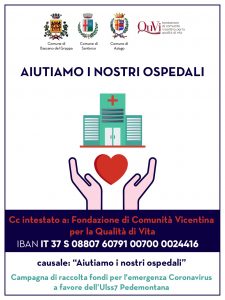 La campagna ha lo scopo di aiutare l’Ulss 7 nell’acquisto di dispositivi utili a fronteggiare le urgenze, dispositivi che torneranno utili anche in futuro.Il Sindaco di Bassano del Grappa Elena Pavan, di Asiago Roberto Rigoni Stern, e di Santorso Franco Balzi lanciano un appello a tutti i cittadini perché la raccolta fondi possa sostenere l’Azienda Ulss 7 in questo difficile momento.