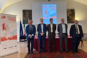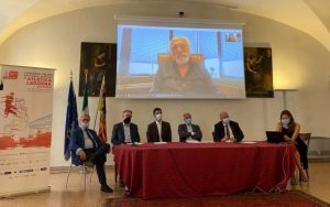 Nelle foto l’intervento del presidente Giomi in video-collegamento e i relatori della conferenza stampa: da sinistra Dino Ponchio, Franco Conzato, Leopoldo Destro, Diego Bonavina e Fabio Bui